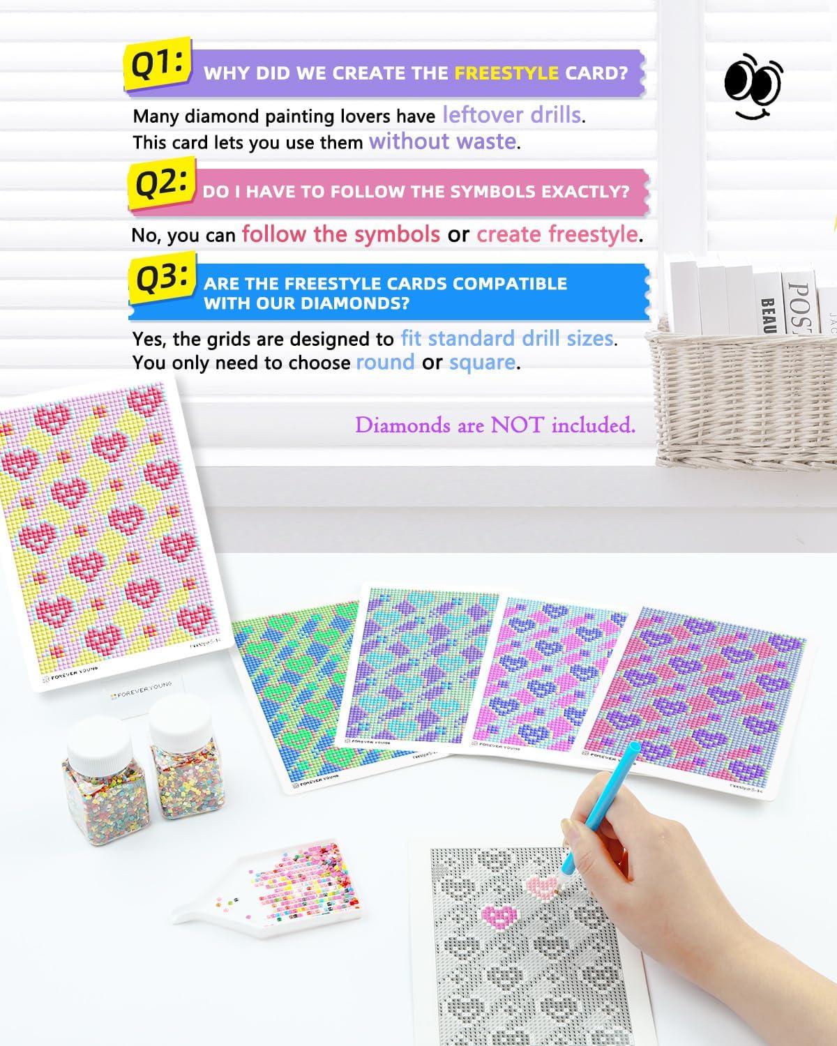 Three Creative Ways to Play: Explore 3 fun styles with these freestyle diamond painting cards! Follow symbols but pick your favorite colors for unique effects; decorate the background by adding personal touches; or go fully freeform using the 5-grid guides to create custom patterns. A perfect DIY project using your extra diamond painting beads, and a fun way to practice round drill diamond painting with essential diamond painting accessories and diamond art tools.